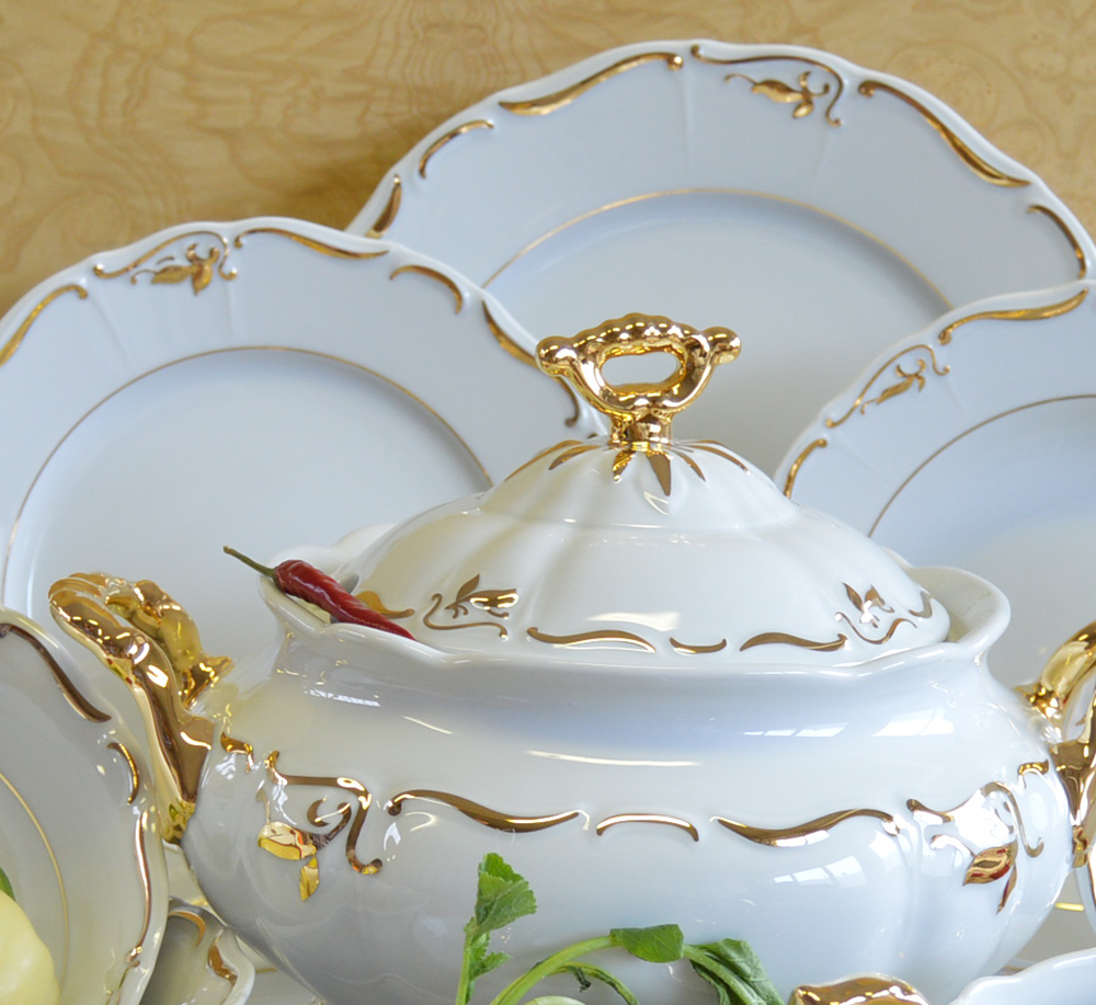 Luxusná obedová súprava z rady Maria Louise so zlatým zdobením. Zlatý reliéfny povrch, zvlnené okraje, precízne vypracovanie – Maria Louise je porcelán, ktorý vždy vynikne na Vašom prestretom stole, alebo ako honosný dar Vašim blízkym či priateľom.